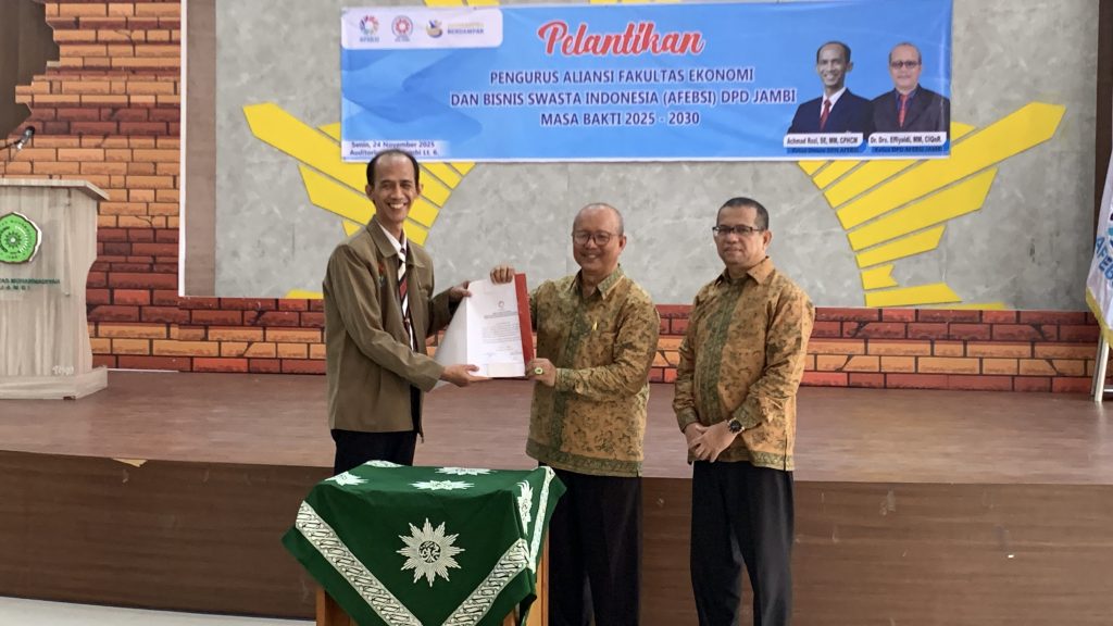 news.afebsi.or.id — Pelantikan AFEBSI Jambi yang dilaksanakan di Auditorium Universitas Muhammadiyah Jambi, pada hari Senin (24/11/2025) merupakan momentum baik untuk membangun sinergi dan kolaborasi yang produktif diantara anggota FEB PTS di Kota Jambi dalam mendukung Visi dan Misi Perguruan Tingginya. Hal tersebut disampaikan oleh Prof. Dr. Arna Suryani selaku Ketua Dewan Pakar AFEBSI Jambi.