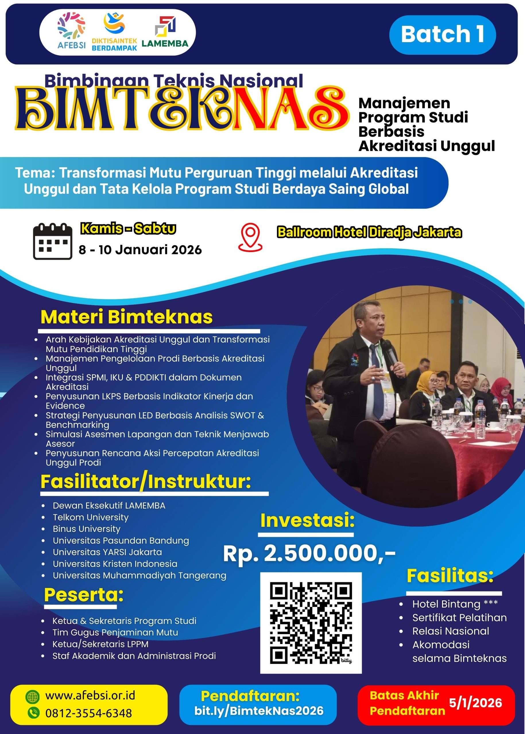 “AFEBSI hadir untuk memastikan bahwa setiap Program Studi mampu beradaptasi dengan perubahan standar mutu, menjawab tuntutan industri, dan membangun tata kelola yang tidak hanya patuh regulasi tetapi juga berdaya saing global. Bimteknas ini menjadi momentum penting untuk memperkuat transformasi mutu perguruan tinggi melalui sinergi, kompetensi, dan komitmen bersama,” ujarnya.